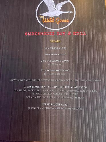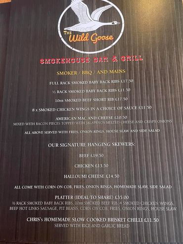 At the wild goose we pride ourselves with producing good quality food. All our meat is freshly chosen from good suppliers and smoked in house. Our signature dishes are all homemade. The beef ribs and signature hanging skewers speak for them selves.